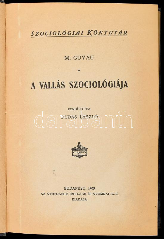Guyau, [Jean-Marie]: A vallás szociológiája. Ford.: Rudas László. Szociológiai Könyvtár. Bp., 1909, Athenaeum, 383+(1) p. Kiadói egészvászon-kötés.
