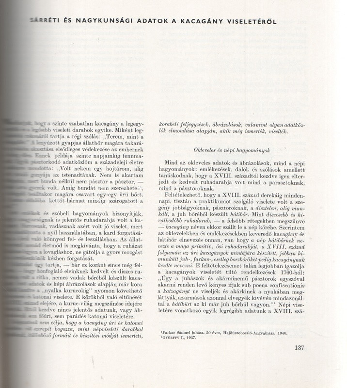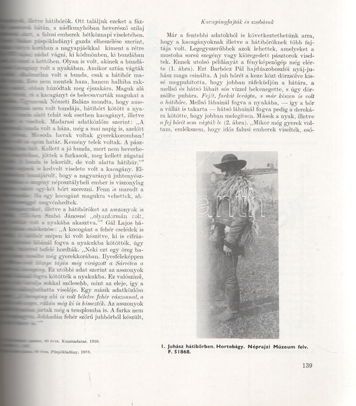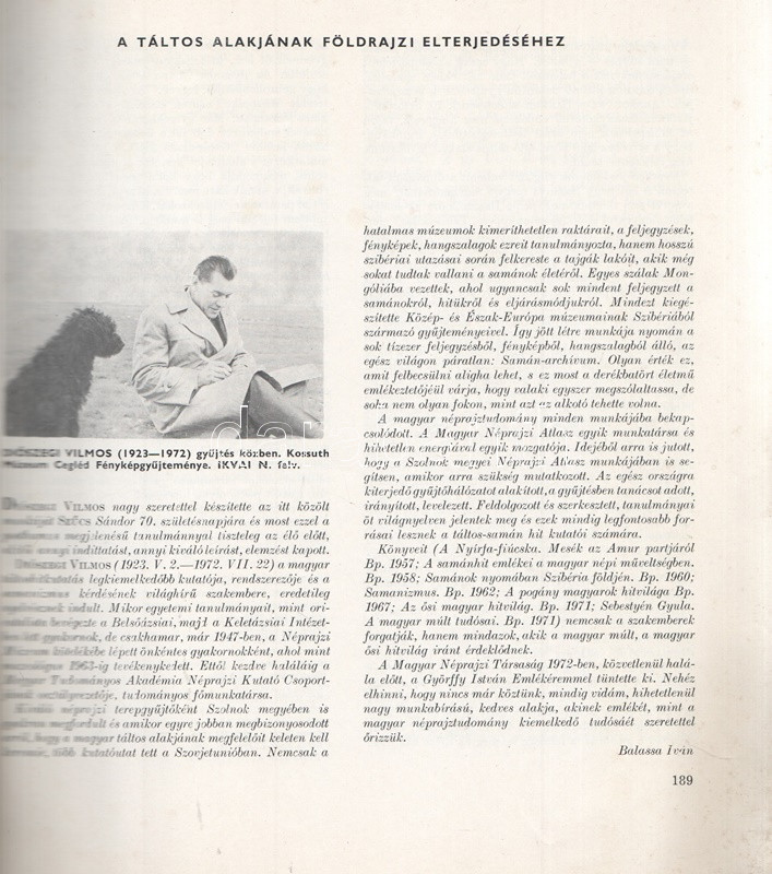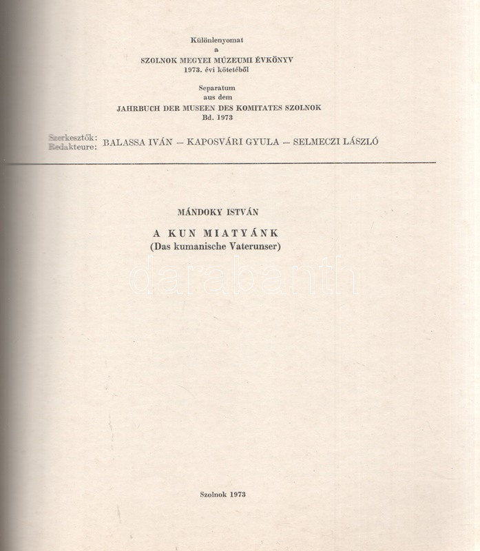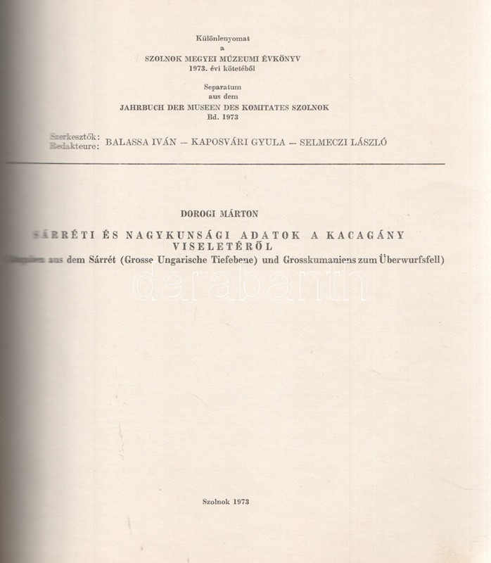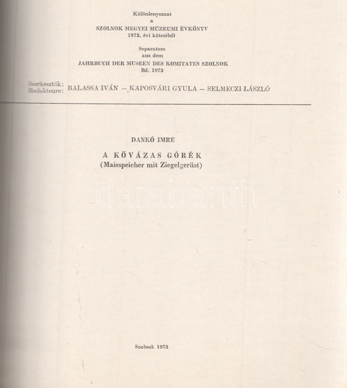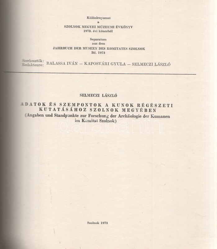 Kunsági néprajzi tanulmányok kolligátuma. 11 tanulmány a Szolnok Megyei Múzeumi Évkönyv 1973. évi évkönyvébÅ‘l. [Egybekötve]. A legváltozatosabb témájú néprajzi tanulmányok szövegét oldalszámozáson belül gazdag illusztrációs anyag kÃséri. Minden tanulmány után rövid német és orosz nyelvű rezümé. A tanulmányok: --- Diószegi Vilmos: A táltos alakjának földrajzi elterjedéséhez. --- Betkowski JenÅ‘: Képek az egykori szolnoki fahajózás történetébÅ‘l. Teleltetés. [Kétszeresen bekötve.] --- Dankó Imre: A kÅ‘vázas górék. --- Dorogi Márton: Sárréti és nagykunsági adatok a kacagány viseletérÅ‘l. --- Selmeczi László: Adatok és szempontok a kunok régészeti kutatásához Szolnok megyében. --- Mándoky István: A kun Miatyánk. --- Filep Antal: Az alföldi népéletkutatás úttörÅ‘je, Kiss Bálint. --- Györffy Lajos: Feliratos butéliák a túrkevei Finta Múzeumban. --- Péter László: A Karcagi Múzeum elÅ‘története Szűcs Sándorig. --- Bellon Tibor: Adalékok a karcagi csárdák keletkezéséhez. --- Szabó Lajos: A ,,Mirhó gáttyának" épÃtése. Szolnok, 1973. (PetÅ‘fi Nyomda, Kecskemét). 33-41 + [1] p.; 105-178 p.; 189-216 p.; 261-277 + [1] p. (Különlenyomatok a Szolnok Megyei Múzeumi Évkönyv 1973. évi kötetébÅ‘l.) Zsinórral fűzött, enyhén elszÃnezÅ‘dött kiadói borÃtóban. Valamennyi különlenyomat elsÅ‘ és hátsó borÃtója bekötve. Jó példány.