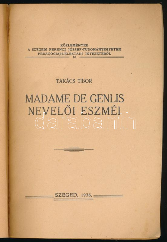 Takács Tibor: Madame de Genlis nevelői eszméi. Közlemények a Szegedi Ferencz József-Tudományegyetem Pedagógiai-Lélektani Intézetéből 10. Szeged, 1936, (Hungária-ny.), 78+(2) p. Kiadói papírkötés, kissé viseltes, koszos borítóval.