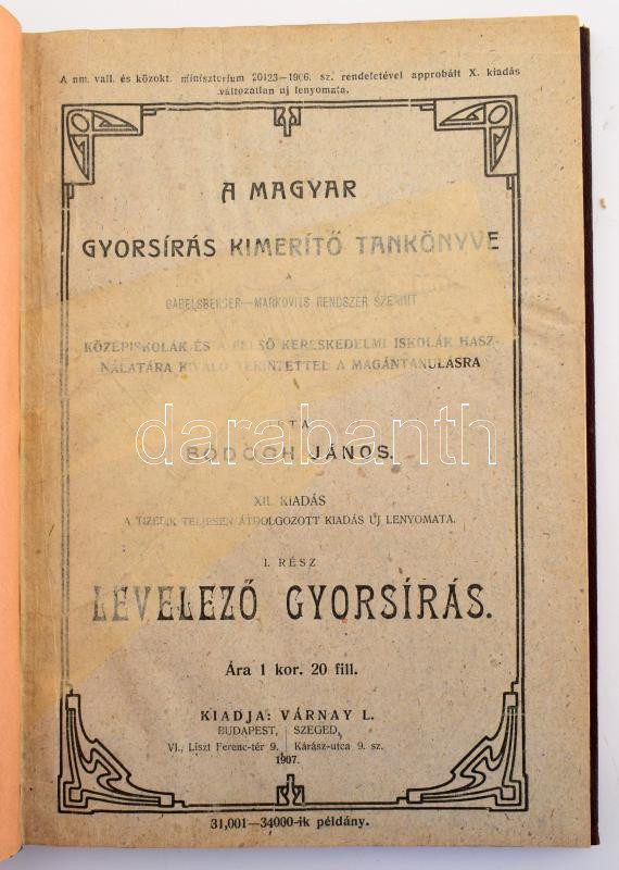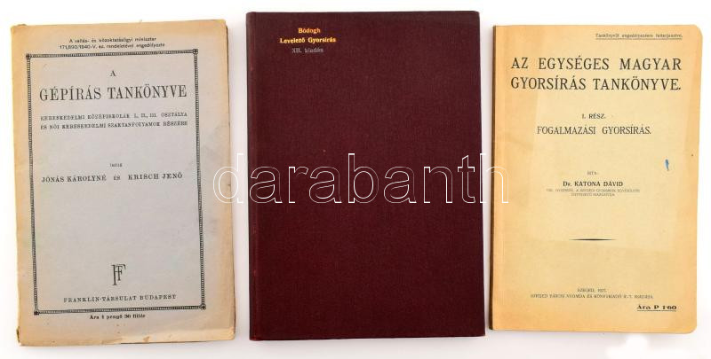 3 db gépírás/gyorsírás témájú könyv: Bódogh János: A magyar gyorsírás kimerítő tankönyve a Gabelsberger-Markovits rendszer szerint. I. rész: Levelező gyorsírás. Bp.-Szeged, 1907, Várnay L., 1 (címkép) t.+ 87+(1) p.+ XXIV p. Átkötött egészvászon-kötésben, az eredeti papírborító bekötve. + Katona Dávid: Az egységes magyar gyorsírás tankönyve. I. rész: Fogalmazási gyorsírás. Szeged, 1927, Városi-ny., 56 p. Kiadói papírkötés. + Jónás Károlyné - Krisch Jenő: A gépírás tankönyve kereskedelmi középiskolák I., II., III. osztálya és női kereskedelmi szaktanfolyamok részére. Bp., [1940], Franklin-Társulat, 120 p. Kiadói papírkötés, kissé sérült.