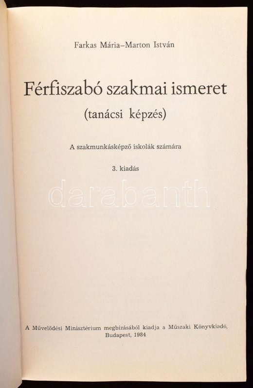 Marton István Farkas Mária: Férfiszabó szakmai ismeret (tanácsi képzés... https://www.darabanth.com/en/500-Online-auction/500.0/Books/Books-Technics~2000072/Marton-Istvan-Farkas-Maria-Ferfiszabo-szakmai-ismeret-tanacsi-kepzes-A-szakmunkask-isk~II3410470
