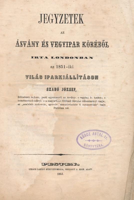 https://www.darabanth.com/en/500-Online-auction/500.0/Books/Books-Technics~2000072/Szabo-Jozsef-Jegyzetek-az-asvany-es-vegyipar-korebol-Irta-Londonban-az-1851-iki-vilag-ip~II3407846