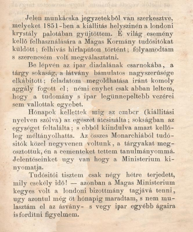 Szabó József: Jegyzetek az ásvány- és vegyipar köréből. Irta Londonban az 1851-iki világ iparkiállításon - - . Pest, 1853, Lukács László-ny., 2 sztl. lev.+ 65-160 p. Papírkötésben, viseltes, sérült borítóval, ázásnyomokkal, tulajdonosi bélyegzővel. (Ritka!)