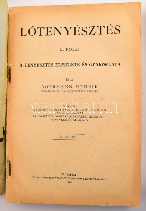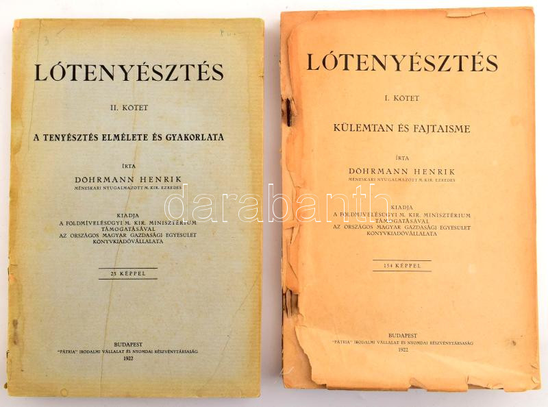 Döhrmann Henrik: Lótenyésztés I-II. köt. I. kötet: Külemtan és fajtaisme. II. köt.: A tenyésztés elmélete és gyakorlata. Bp., 1922., Országos Magyar Gazdasági Egyesület,("Pária"-ny.), 251 p.; 258 p. Első kiadás. Szövegközti fekete-fehér képekkel illusztrált. Kiadói papírkötések, az I. kötet elülső borítója hiányzik, a címlapja leszakadt, és a hátsó borítója foltos, leszakadt, a II. kötet borítója foltos, a gerince sérült, a hátsó borítón gyűrődés. Mind a két kötet felvágatlan lapokkal.