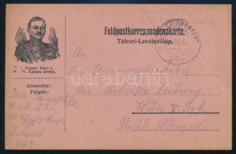 https://www.darabanth.com/en/500-Online-auction/500.0/Hungarian-philately-and-postal-history/Austro-Hungarian-fieldpost-WWI~43/1917-Tabori-posta-levelezolap-KuK-Inf-Rgt-No87-XV-Feldkomp-plus-FP-393-a~II3410312