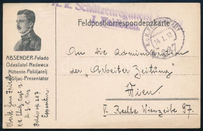1918 Tábori posta levelezőlap "K.k. Schützenregiment"