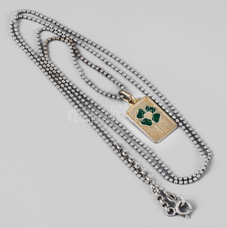 Ezüst (Ag) golyós nyaklánc zománcozott aranyozott lóhere medállal, jelzett, h: 74 cm; 2,5×1,2 cm, bruttó: 7,3 g
