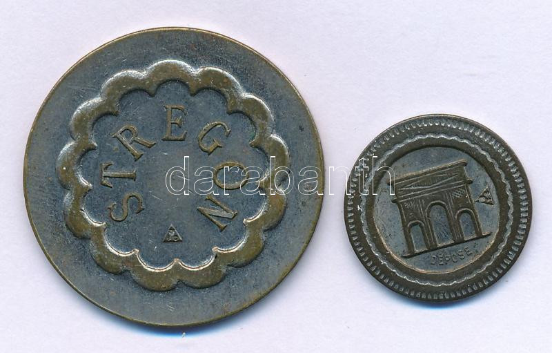France ND(1902-1937) "30c A CONSOMMER / DÉPOSE" two-sided silver plated bronze token (18,5mm) + Olaszország DN "10c VALORE IN COSUMAZIONE / STREGON" two-sided silver plated bronze token (30mm) C:VF, silver plate worn