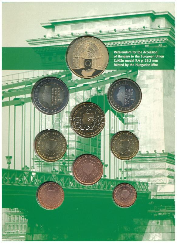 Netherlands 2003. 1 Cent - 2 Euro (8xdiff) + "Referendum for the Accession of Hungary to the European Union" Cu-Ni-Zn commemorative medal (29,2mm), "Hungarian National Bank Information Set" coin set in cardboard case, in Hungarian and in English language C:PP