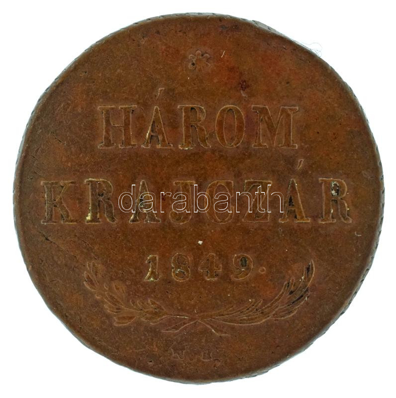 https://www.darabanth.com/en/500-Online-auction/500.0/Numismatics/Hungarian-coins-and-coins-with-Hungarian-mint-marks~1500055/1849NB-3kr-Cu-technologiai-hibas-veret-enyhen-elfordult-hatlap-enyhe-veroto-repedes-TXF-V~II3402471