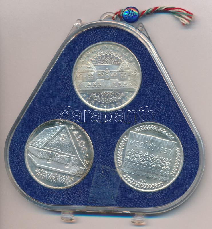 Csúcs Viktória (1934-) DN "Kalocsa" + "Kiskunhalas - Csipkeház" + "Mezőkövesd" kétoldalas, peremen jelzett Ag emlékérem szett (~17g/0.925/32mm), közös "ÁPV" műanyag tokban T:AU (eredetileg PP), sérült tok, szétnyílik
