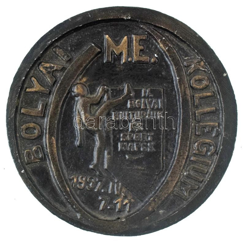 Description: Juhász Pál (1934-) 1997. "Bolyai M.E. Kollégium - II. Bolyai Kulturális és Sport Napok / Miskolc " kétoldalas, bronzpatinázott Al emlékérem (108mm) T:XF,VF, ki van fúrva az alja