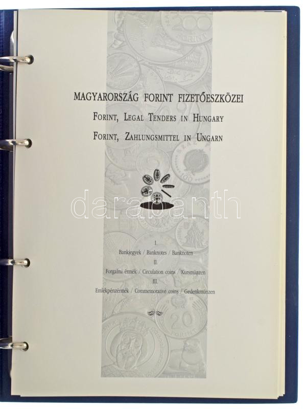 Magyarország forint fizetőeszközei. MNB kiadás, információk a forintrendszerről 2012-ig bezárólag, bankjegyekről és emlékpénzekről, négygyűrűs műbőr mappában.
