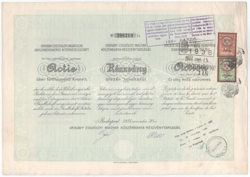 Budapest 1923. "Urikány-Zsilvölgyi Magyar Kőszénbánya-Részvénytársaság" részvénye 5000K-ról szelvényekkel, szárazpecséttel, felülbélyegzésekkel T:XF,VF, pici szakadás