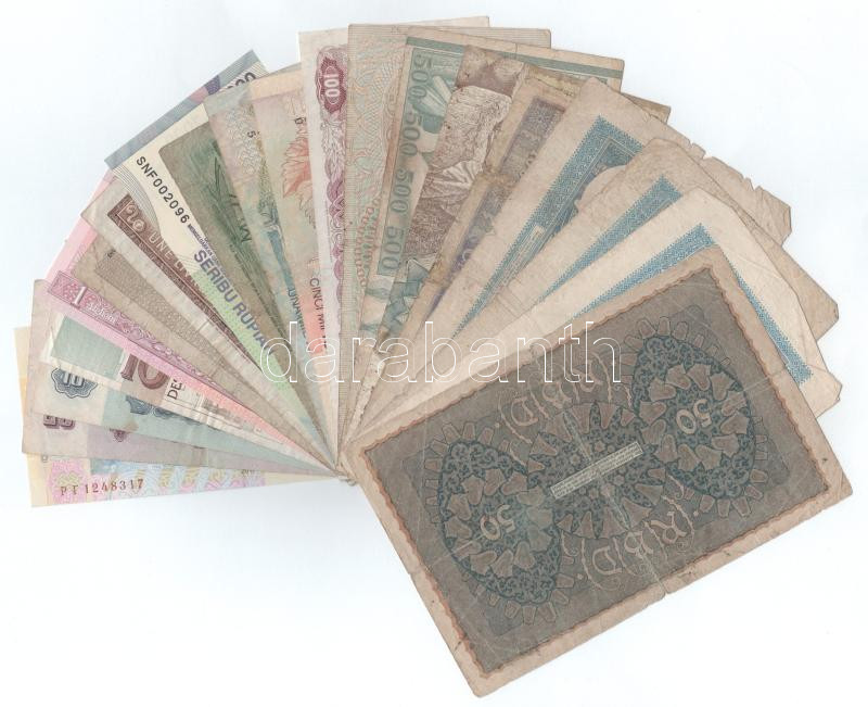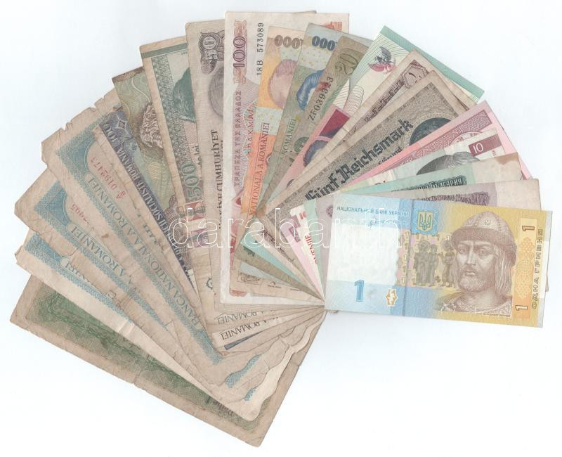 Mixed, 20pcs foreign banknote lot, in it Romania 1943. 5000 Lei + 1944. 5000 Lei + 1945. 5000 Lei, etc. C:F,VG, including 3pcs AU