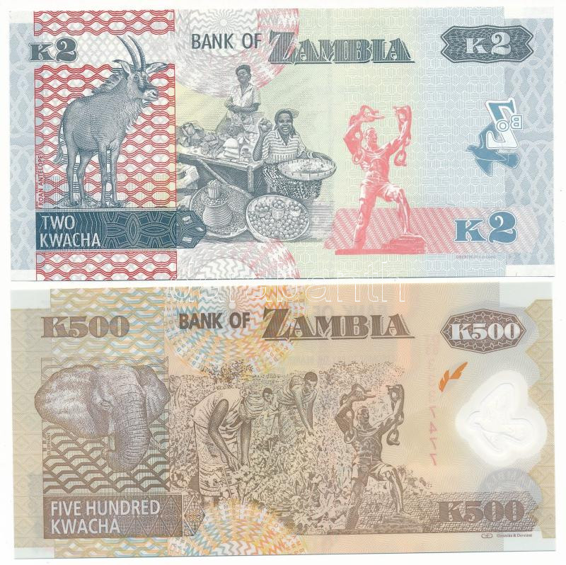 Zambia 2011. 500 Kwacha + 2018. 2 Kwacha C:UNC