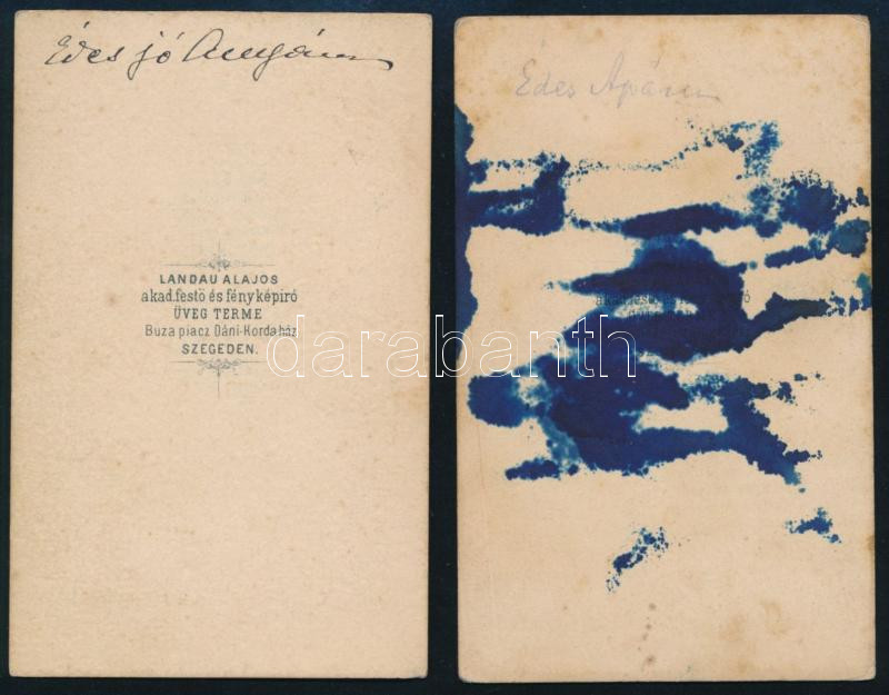 Description: cca 1865 Előkelő hölgy és úr (házaspár) portréi, 2 db vizitkártya Landau Alajos szegedi műterméből (,,Landau Alajos akad. festő és fényképiró üveg terme, Buza piacz, Dáni-Korda ház"), az egyik foltos, 10x6,5 cm