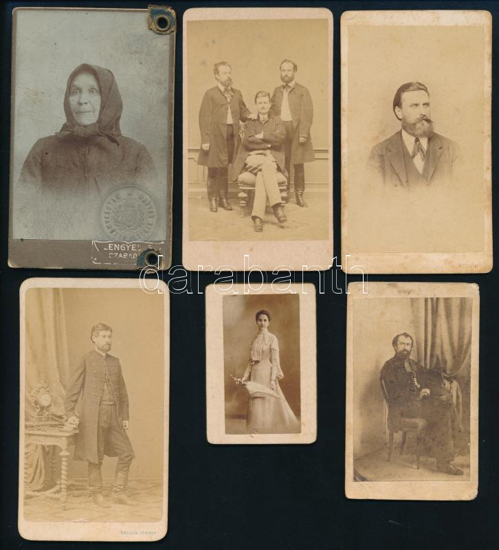 cca 1870-1900 Férfi és női portrék, 6 db keményhátú fotó (vizitkártya, mignon fotó), különféle műtermekből, közte egy MÁV szárazbélyegzővel ellátott, változó állapotban, 6,5x4,5 cm és 10,5x6,5 cm között