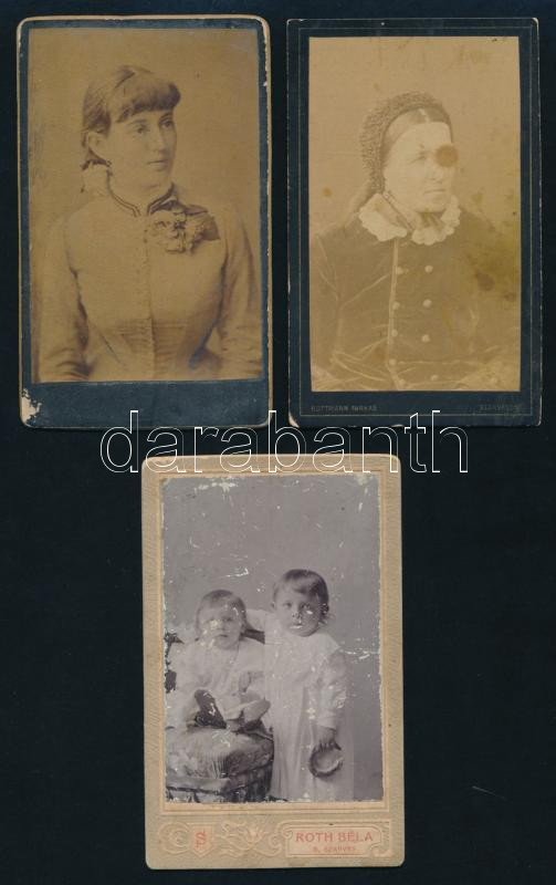 cca 1880 3 db keményhátú fotó Roth Béla, Rottmann Farkas, Drescher műterméből, sérülésekkel, 10,5×6,5 cm