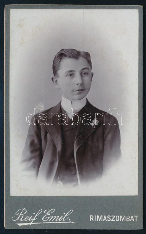 Description: cca 1890 Elegáns fiú (Majoros János) portréja, vizitkártya Reif Emil rimaszombati műterméből (,,Elsö Gömörmegyei fényirda"), a hátoldalon feliratozva, 10,5x6,5 cm (Ritka műterem!)