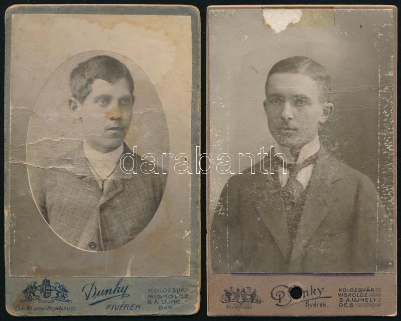 Description: cca 1900-1910 Fiatalemberek portréi, 2 db vizitkártya a Dunky fivérek (Kolozsvár-Miskolc-Sátoraljaújhely-Dés) műterméből, viseltes állapotban, 11x6,5 cm