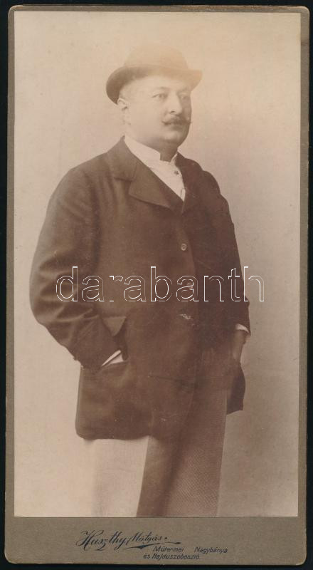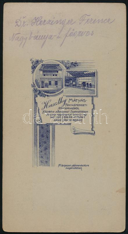Description: cca 1910 Dr. Herzinger Ferenc nagybányai főorvos portréja, kabinetfotó Huszthy Mátyás (Nagybánya-Hajdúszoboszló) műterméből, a verzón a műterem képével, feliratozva, 20,5x11 cm