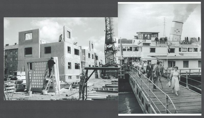 Description: cca 1959 Sztálinváros (ma Dunaújváros) első panelépülete készül; üdülőhajó érkezik a városba; 2 db modern nagyítás, jelzés nélkül, 21x15 cm és 15x21 cm