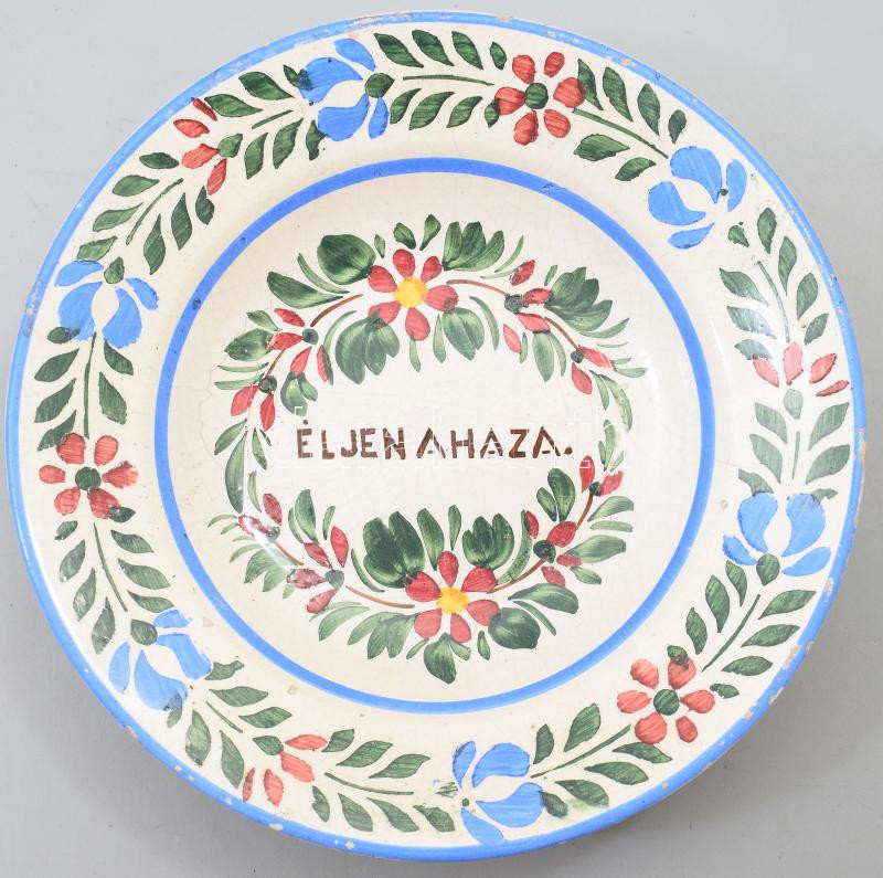 cca 1890 Éljen a haza. feliratos fajansz dísztál, jelzés nélkül, kopással, mázrepedéssel, d: 23 cm