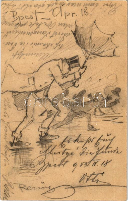 1903 Budapest Április 18-án. Kézzel rajzolt humoros művészlap / hand-d...