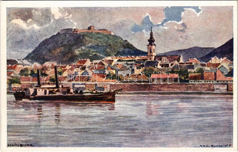 Hainburg von der Donau aus, Erste k. k. priv. Donau -Dampfschiffahrts - Gesellschaf, Wien / general view, castle, steamship s: Rud. Schmindt