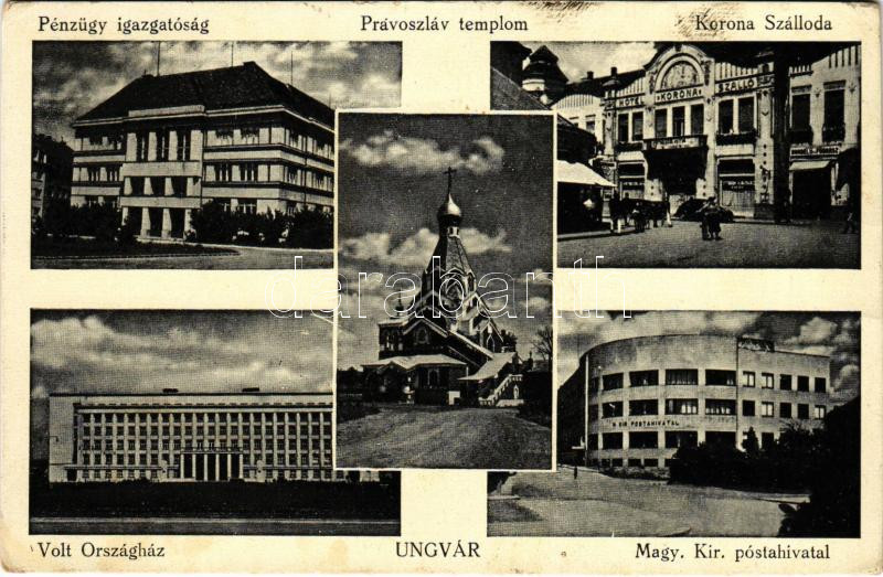 1940 Ungvár, Uzshorod, Uzhhorod, Uzhorod; Pénzügyigazgatóság, Pravoszláv templom, Hotel Korona szálloda, automobil, üzletek, Volt Országház, M. kir. postahivatal / financial directorate, Orthodox church, hotel, automobiles, shops, former parliament, post office (EK)