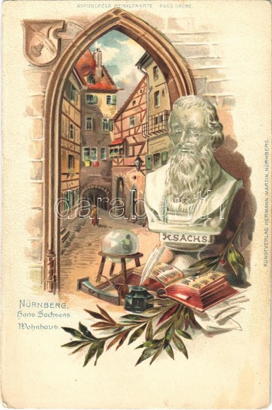 Nürnberg, Nuremberg; Hans Sachsens Wohnhaus. Nürnberger Meisterkarte Hans Sachs. Art Nouveau, Emb. litho (fl)