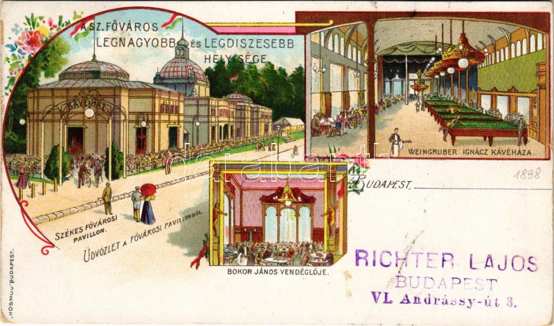 1898 (Vorläufer) Budapest XIV. Városligeti fővárosi pavillon. Bokor Já... https://www.darabanth.com/en/500-Online-auction/500.0/Postcards/Hungary~2500005/1898-Vorlaufer-Budapest-XIV-Varosligeti-fovarosi-pavillon-Bokor-Janos-vendegloje-es-Weingruber~II3404054