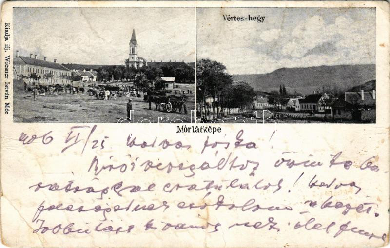 1906 Mór, látkép, Vértes-hegy, Piactér, templom. Ifj. Wiesner István kiadása (gyűrődések / creases)