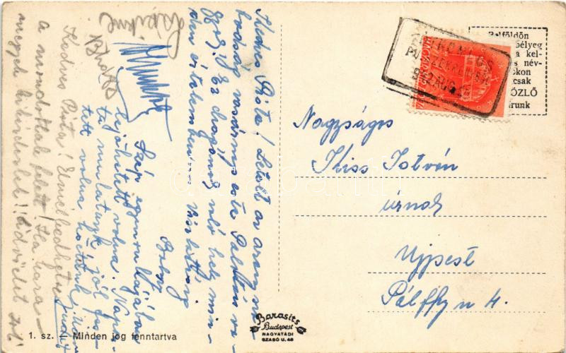 1942 Tótkomlós, Római katolikus templom, Országzászló, Evangélikus templom, Érparti rész, Polgári iskola. Gyömrei kiadása + "TÓTKOMLÓS PU. SZEKRÉNYBŐL" (gyűrődés / crease)
