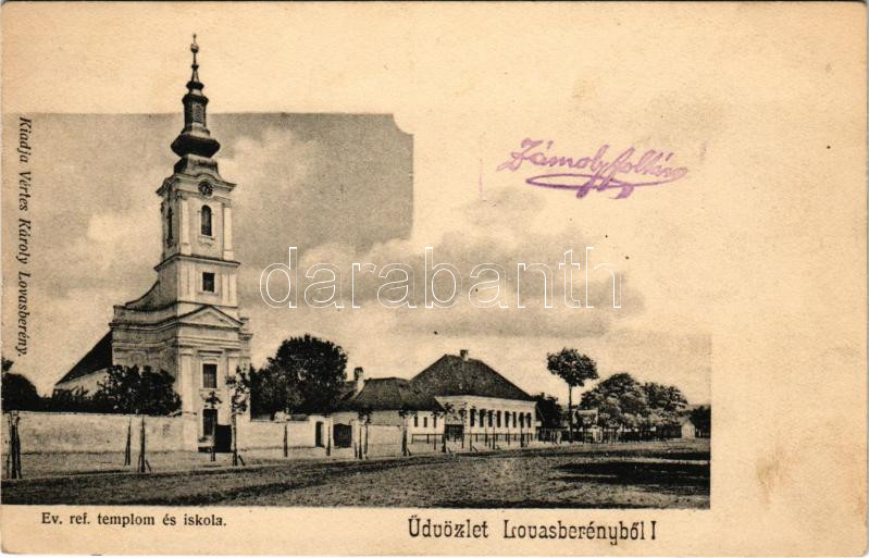 Lovasberény, Evangélikus református templom és iskola. Vértes Károly kiadása (EK)