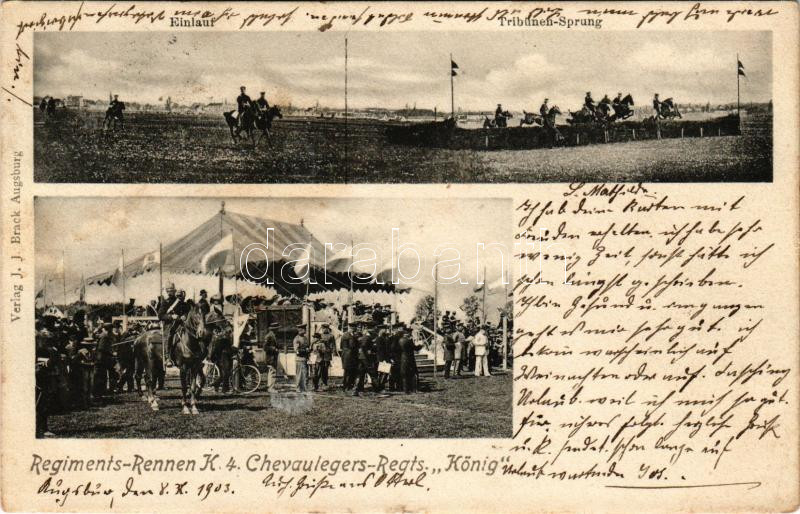Description: 1903 A 4. könnyűlovassági ezred / Regiments-Rennen 4. Chevaulegers-Regiment ,,König". Einlauf, Tribünen-Sprung. Verlag J. J. Brack / German 4th Royal Bavarian Chevau-légers "King" soldiers (fl)