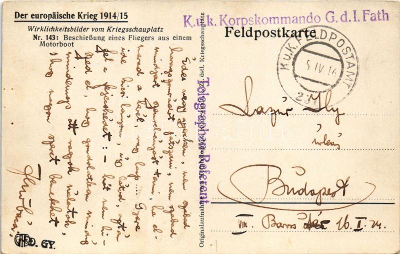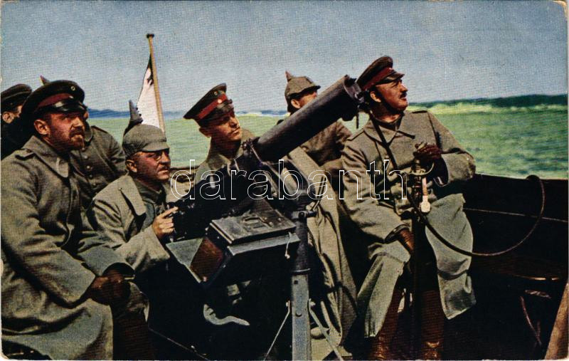 Description: 1915 Beschießung eines Fliegers aus einem Motorboot. Der europäische Krieg 1914/15. Wirklichkeitsbilder vom Kriegsschauplatz / első világháborús német és osztrák-magyar katonák, motorcsónakból tüzelés egy repülőgépre / WWI German and Austro-Hungarian K.u.K. military, firing at an aircraft from a motorboat. Feldpostkarte + "K.u.k. Korpskommando G.d.I.Fath + "K.u.k. Feldpostamt 231" (EK)