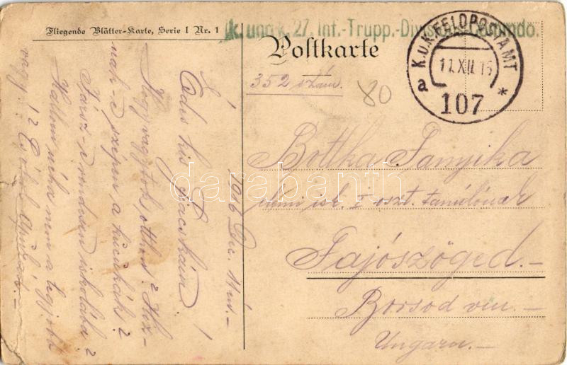 Description: 1915 Die Liebeszigarre. Die wahre Liebe ist das nicht!. Fliegende Blätter-Karte, Serie I. Nr. I. / első világháborús német katonai művészlap, karikatúra, katona cigarettával / WWI German military art postcard, soldier with a cigar s: E.R. + "K.u.k. Feldpostamt 107" + "K. und k. 27. Inf.-Trupp.-Divisions-Comando" (szakadás / tear)