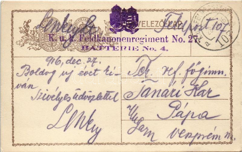 1916 Karácsony 1916. Hadsegélyező Hivatal Vörös Kereszt Szeretetadomány osztálya / WWI Austro-Hungarian K.u.K. military art postcard, Christmas greeting + "K.u.K Feldkanonenregiment No. 27. BATTERIE No. 4."