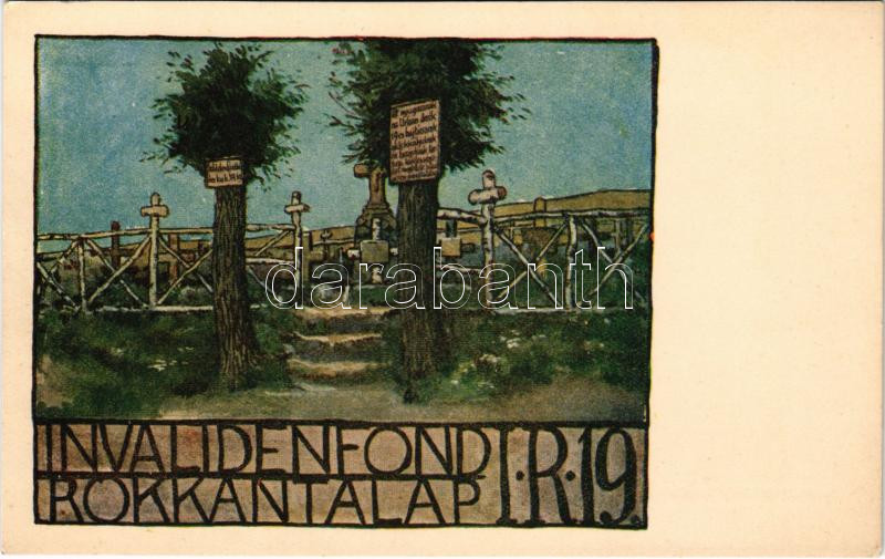 1917 Az ezred temetője a harctéren. Rokkantalap. Cs. és Kir. 19. gy. Ezred / Regimentsfriedhof im Felde. K.u.K. I.R. 19. Invalidenfond / WWI K.u.K. military art postcard s: Biczó + "K.u.k. Infanterie Regiment No: 19. kompagnie"