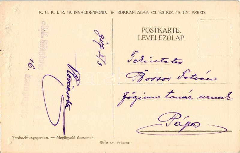 https://www.darabanth.com/en/500-Online-auction/500.0/Postcards/Militaria~2500103/1917-Megfigyelo-orszemek-Rokkantalap-Cs-es-Kir-19-gy-Ezred-Beobachtungsposten-KuK-IR~II3409008