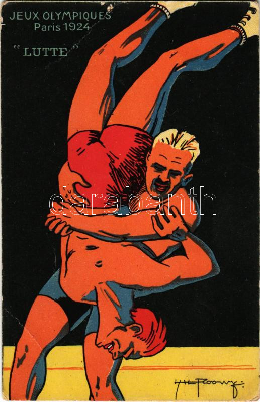 1924 Paris, Jeux Olympiques. Lutte / 1924 Summer Olympics advertisement postcard. Box match. L. Pautauberge litho s: H. L. Roowy (lyuk / pinhole)