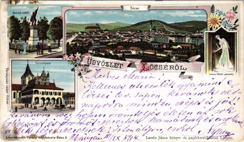 1894 (Vorläufer!!!!) Lőcse, Levoca; Honvéd emlékmű, látkép, városháza, Lőcsei fehér asszony. Schwidernoch Károly műintézete, Latzin János kiadása / military monument, general view, town hall. Art Nouveau, floral, litho (EM)