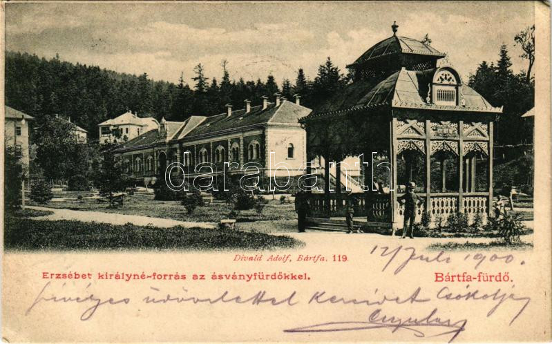 1900 Bártfafürdő, Bardejovské Kúpele, Bardiov, Bardejov; Ásványvízfürdők az Erzsébet királyné forrással. Divald Adolf 119. / spring, spa (EK)