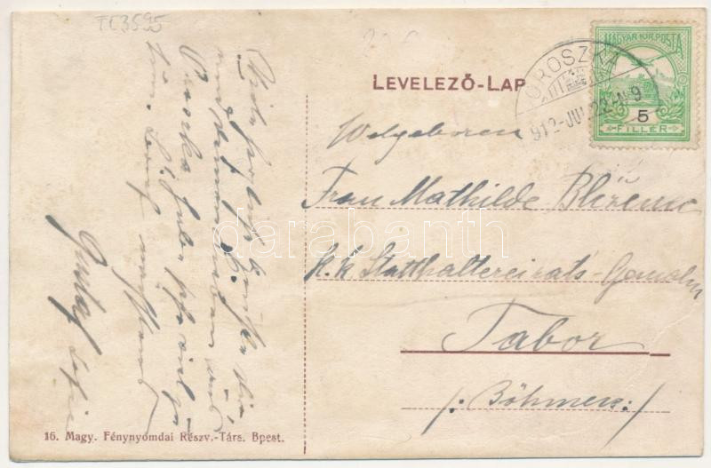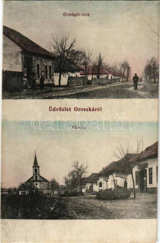1912 Oroszka, Kisoroszi, Pohronsky Ruskov, Oroska; Országút utca, Fő utca, templom, üzletek / street view, main street, church, shops (r)