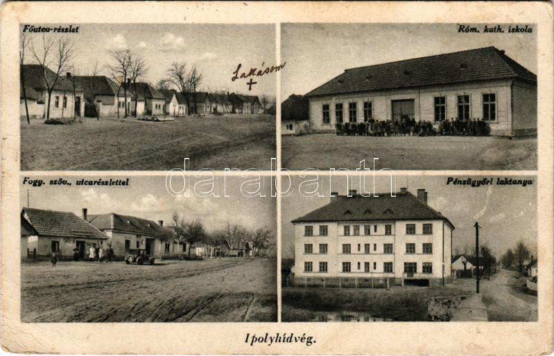 Description: 1939 Ipolyhídvég, Ipelské Predmostie; Fő utca, Római katolikus iskola, Pénzügyőri laktanya, Fogyasztási szövetkezet üzlete és saját kiadása / main street, Catholic school, finance guard barracks, cooperative shop (fl)