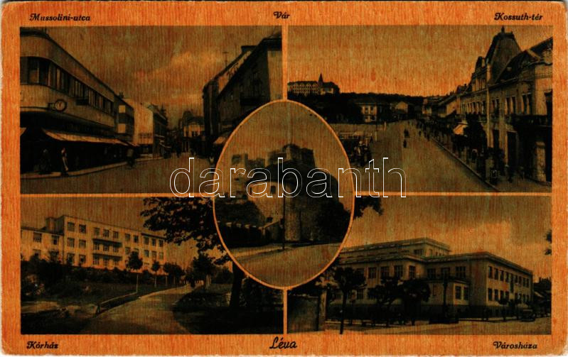 1942 Léva, Levice; Mussolini utca, Kossuth tér, vár, kórház, Városháza / street, square, castle, hospital, town hall (EK)