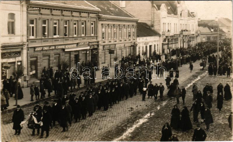 Léva, Levice; ünnepség télen, Medvegy Lajos cukrászdája, Jozef Engel és Syn, Lachky Elek, Kohn Miksa, Holzmann üzlete. Foto Rusznák / procession in winter, confectionery, shops. photo