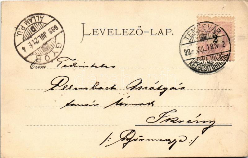Description: 1899 (Vorläufer!) Temesvár, Timisoara; Kossuth Lajos utca, Takarékpénztár, Párisi Nagy Áruház, üzletek. Moravetz Gyula kiadása, Atelier Friedmann M. / street view, savings bank, shops + "GYŐR ÁLLAM P.U." + "TEMESVÁR KÉZBESÍTŐHIVATAL" (EK)